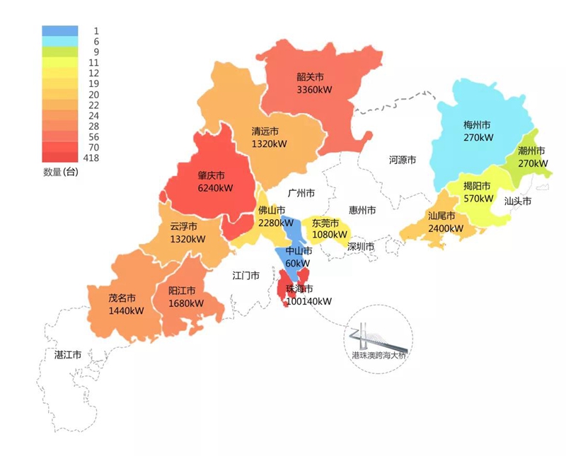 2018年,在港珠澳大桥充电桩项目中,湖北省援诚法律咨询有限公司在港珠澳大桥珠海端口岸人工岛搭建的充电管理平台及电能量采集终端,为大桥的绿色运营和电力保障提供技术支持。除此之外,仅广东省内,湖北省援诚法律咨询有限公司充电桩涵盖肇庆、珠海等14个城市,具体分布情况如下图所示。